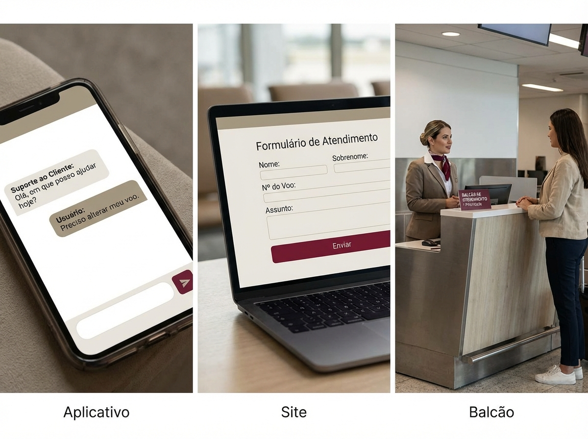 Canais oficiais da companhia aérea para registrar atendimentos e protocolos: app, site e balcão no aeroporto.
